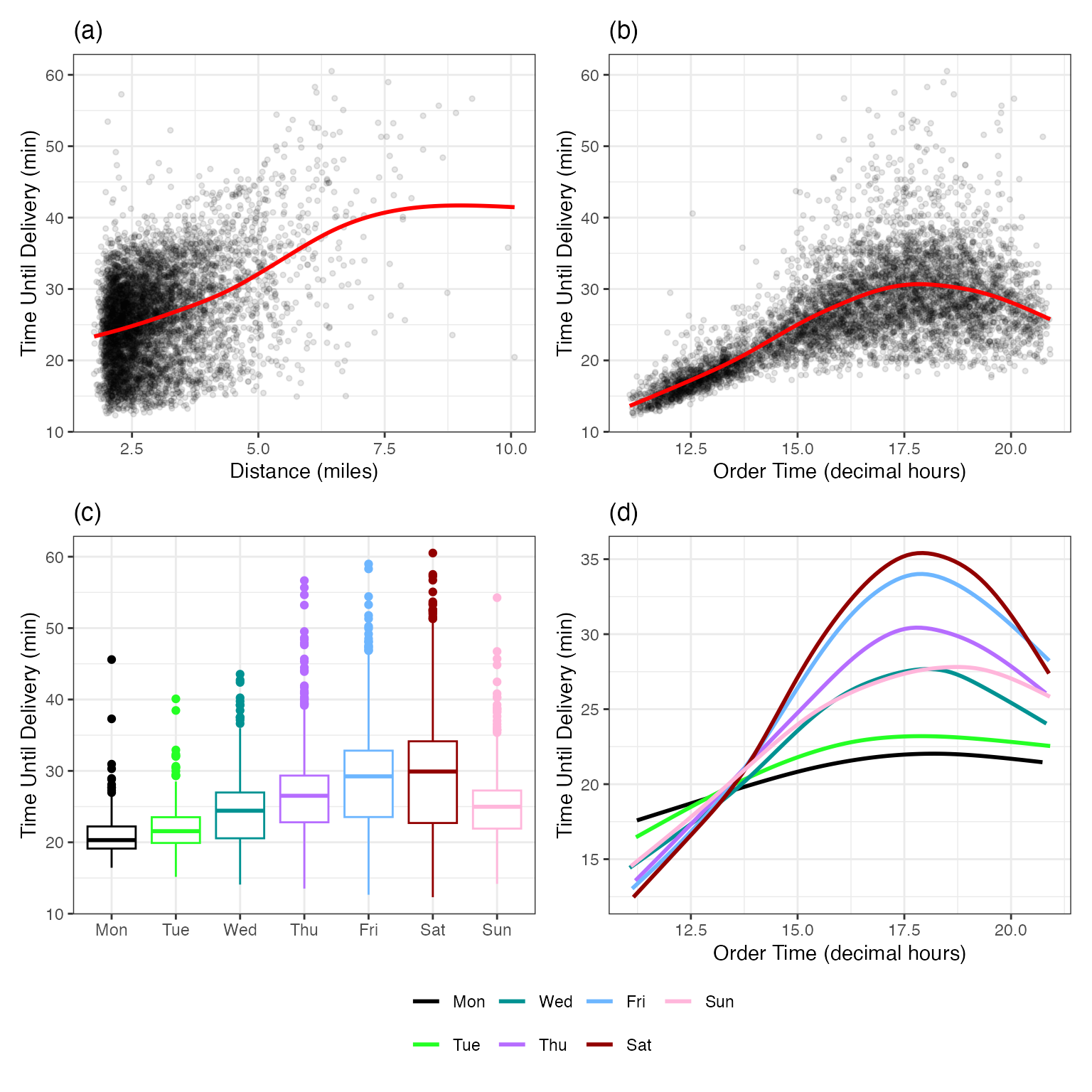 If an order were placed at 12:00 with a distance of 7 km, the predicted delivery time would be −11.17 + 1.76 \times 7 + 1.77 \times 12 = 22.4 minutes.
