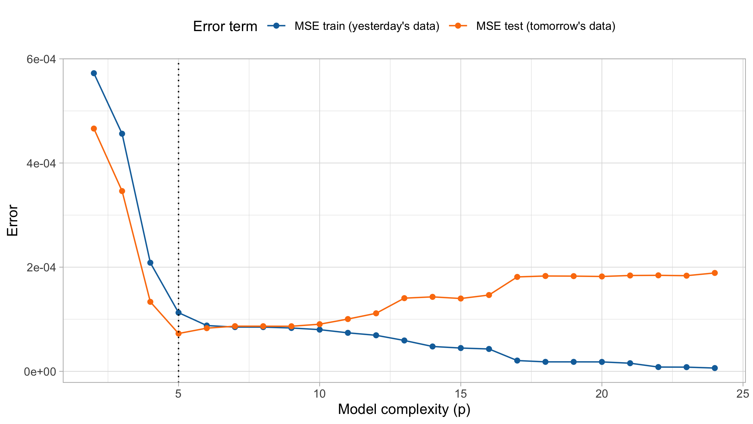 The mean squared error on tomorrow’s data (test) is defined as \text{MSE}_{\text{test}} = \frac{1}{n}\sum_{i=1}^n\{\tilde{y}_i -f(x_i; \hat{\beta})\}^2, and similarly the R^2_\text{test}. We would like the \text{MSE}_{\text{test}} to be as small as possible.