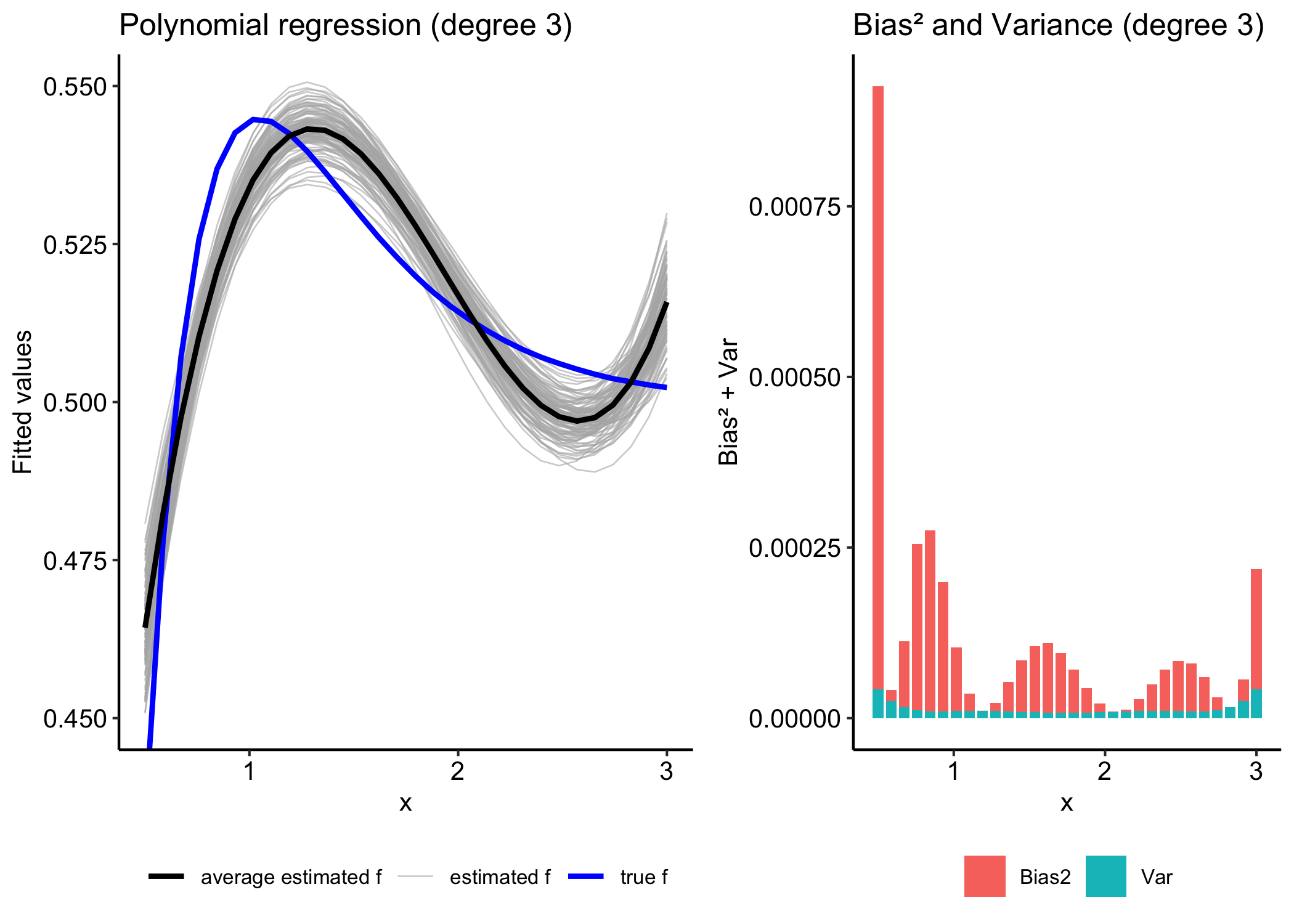 \begin{aligned} \mathbb{E}\big[(f(x_i) - \hat{f}(x_i))^2\big] &= \mathbb{E}\big[(f(x_i) - \mathbb{E}\hat{f}(x_i) + \mathbb{E}\hat{f}(x_i) - \hat{f}(x_i))^2\big] \\ &= \underbrace{\big(f(x_i) - \mathbb{E}\hat{f}(x_i)\big)^2}_{\text{Bias}^2} + \underbrace{\mathrm{Var}\big(\hat{f}(x_i)\big)}_{\text{Variance}}. \end{aligned}