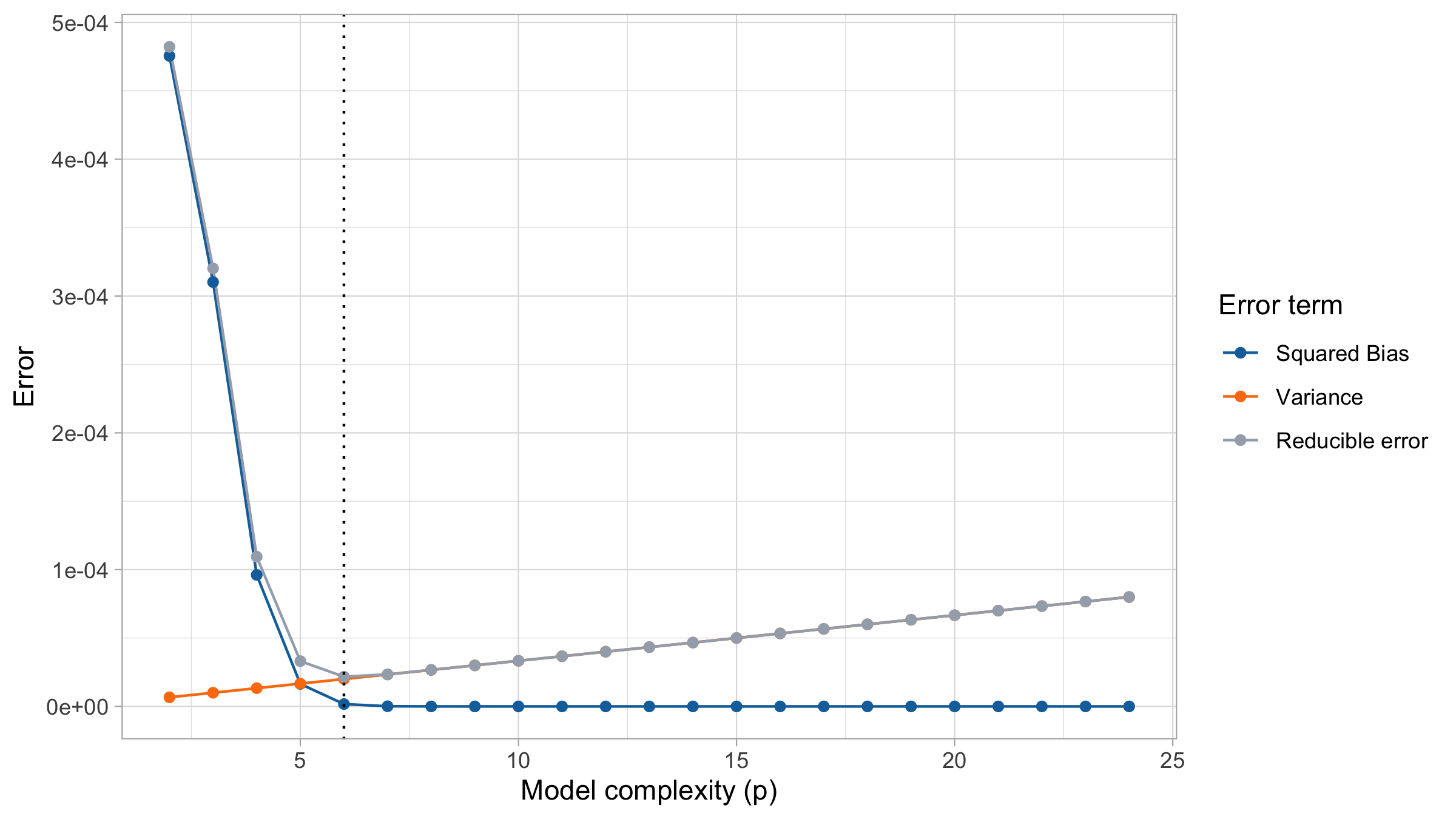 When p grows, the mean squared error first decreases and then it increases. In the example, the theoretical optimum is p = 6 (5th degree polynomial).