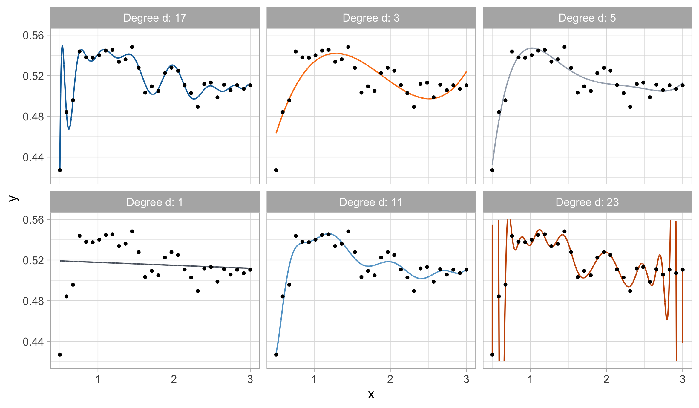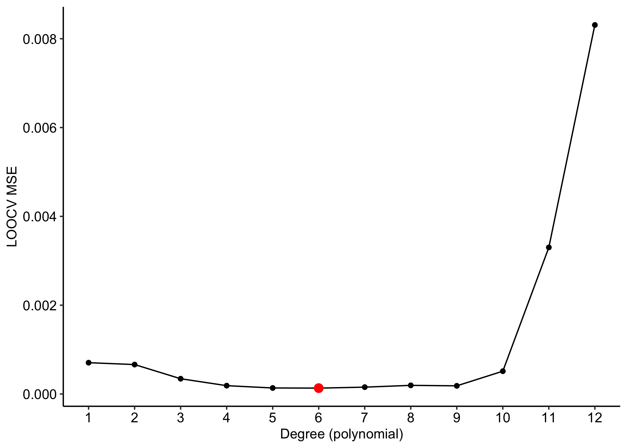 Taking this reasoning to the extreme would lead to the choice d = n-1, so that \text{MSE}_\text{train} = 0, \qquad R^2_\text{train} = 1, i.e., a perfect fit. This procedure is called interpolation.
