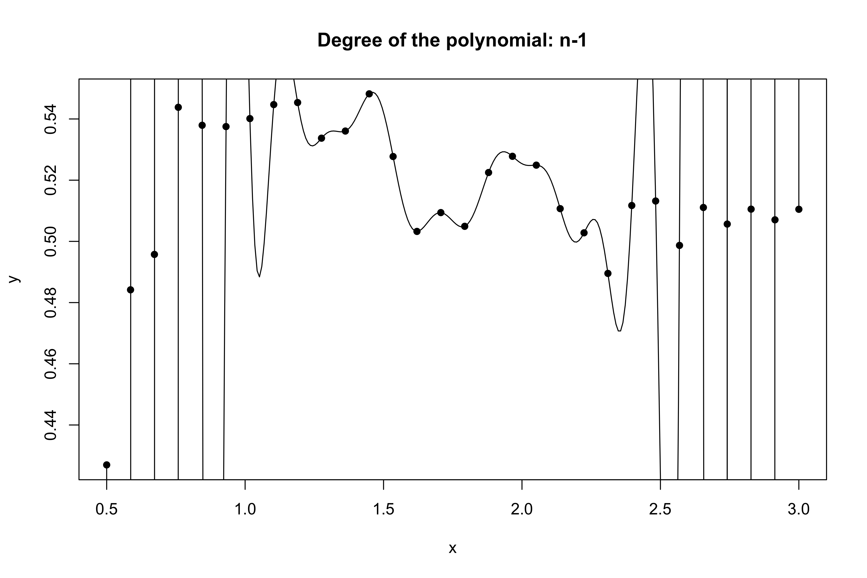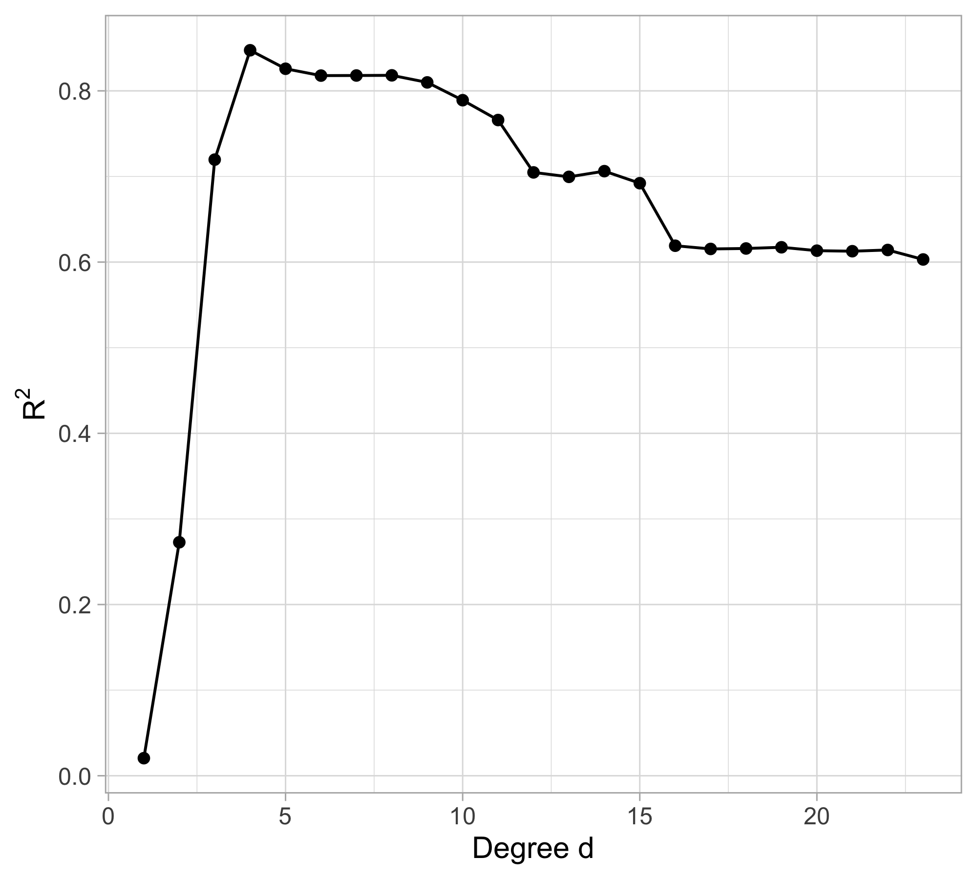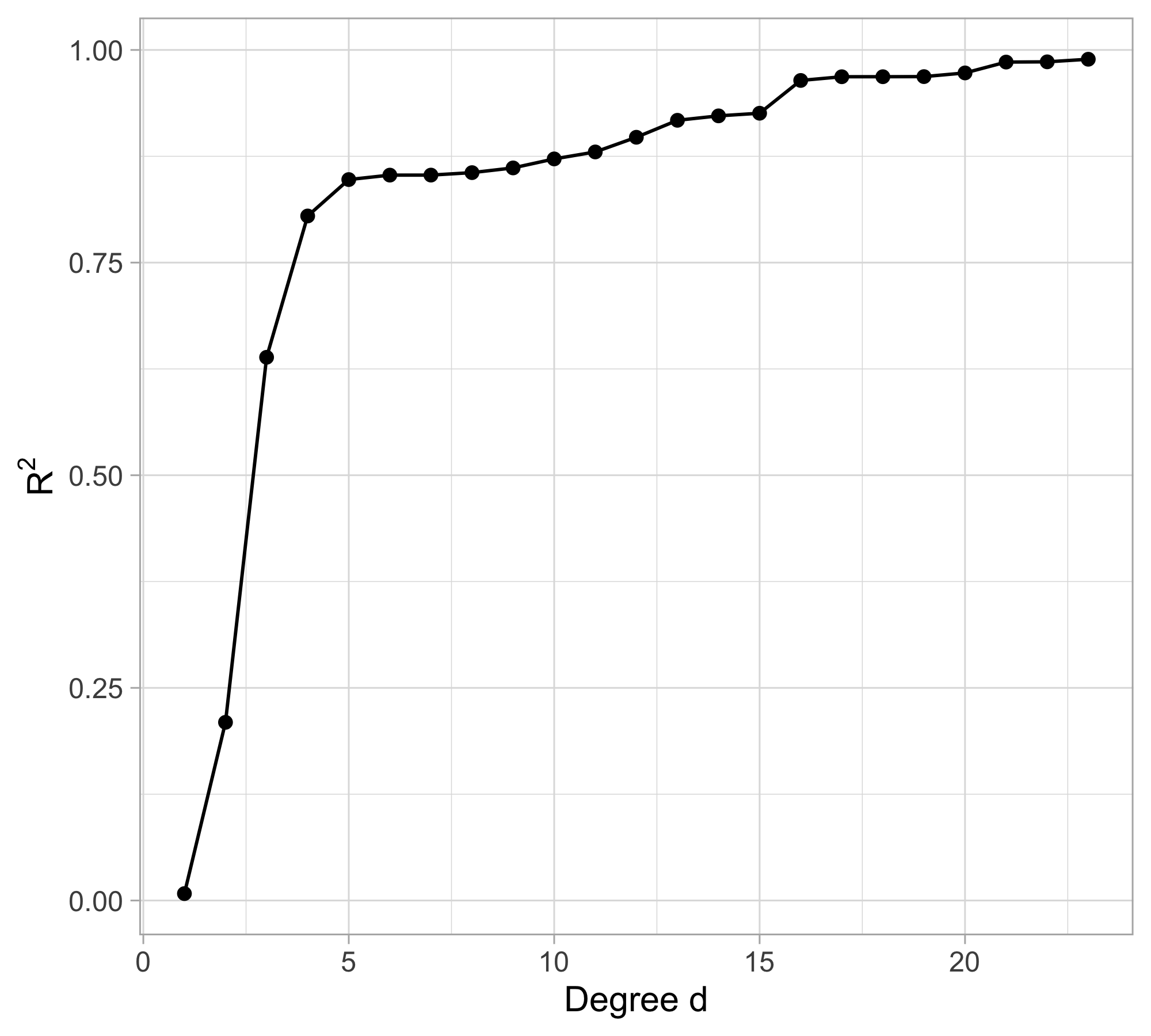 Taking this reasoning to the extreme would lead to the choice d = n-1, so that \text{MSE}_\text{train} = 0, \qquad R^2_\text{train} = 1, i.e., a perfect fit. This procedure is called interpolation.