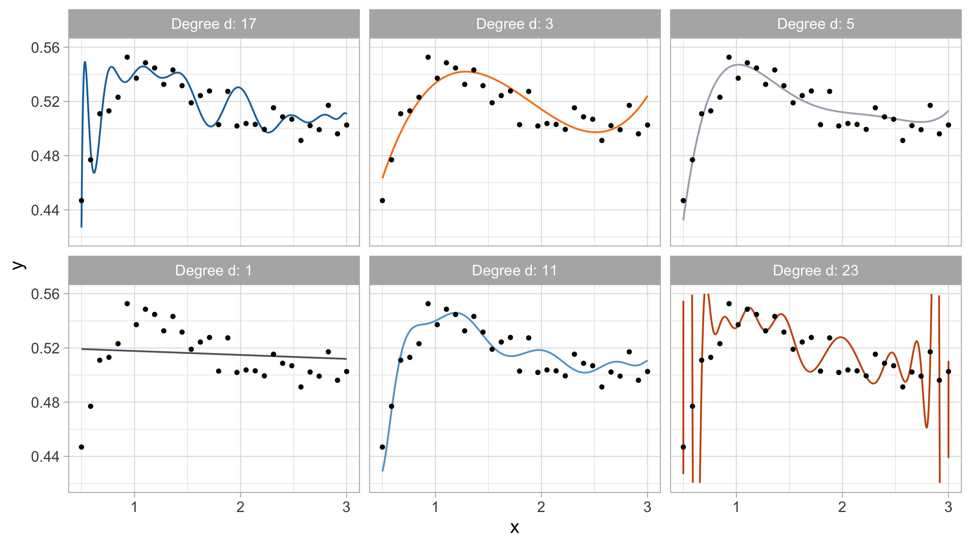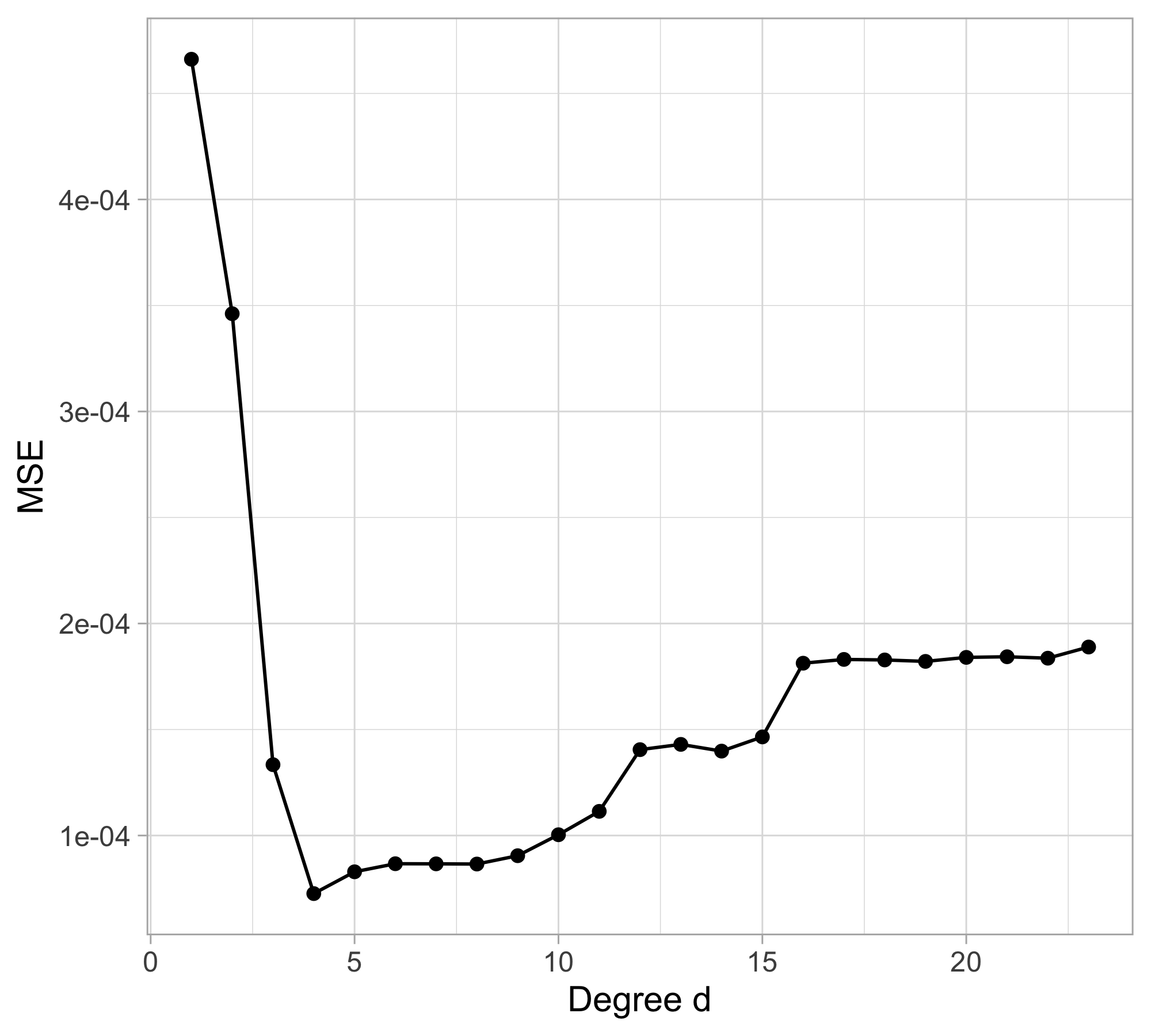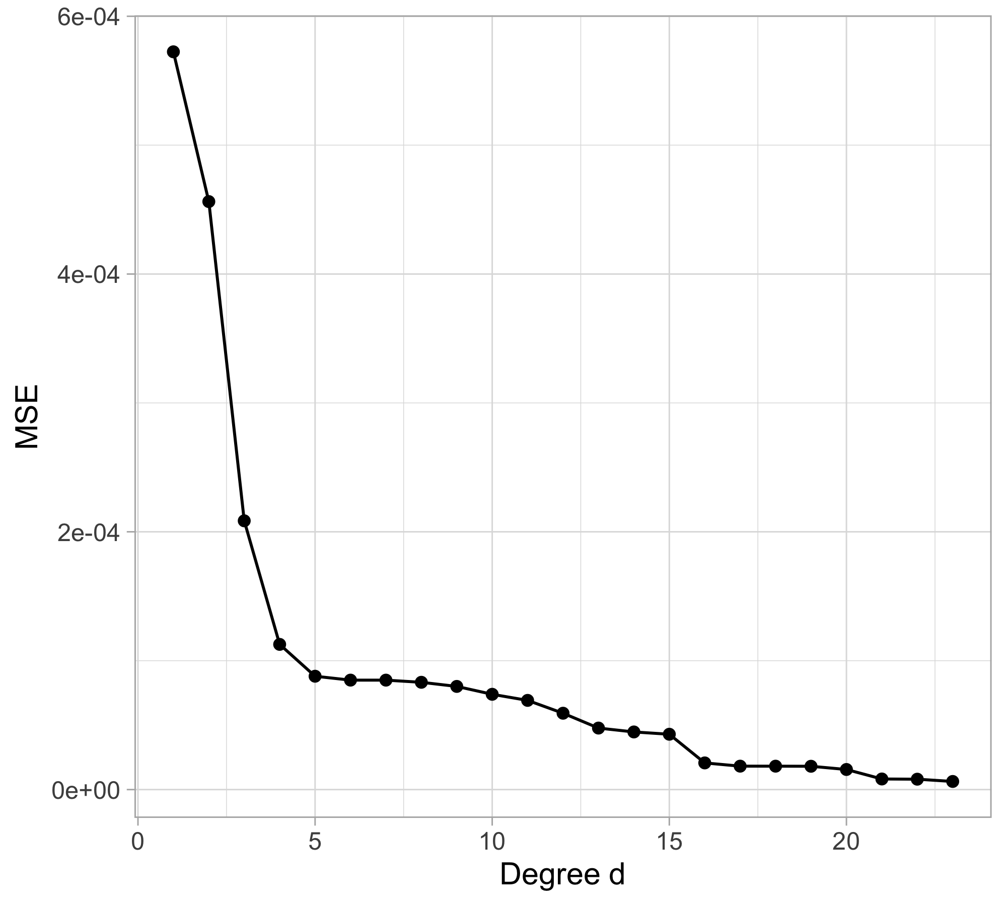 Taking this reasoning to the extreme would lead to the choice d = n-1, so that \text{MSE}_\text{train} = 0, \qquad R^2_\text{train} = 1, i.e., a perfect fit. This procedure is called interpolation.