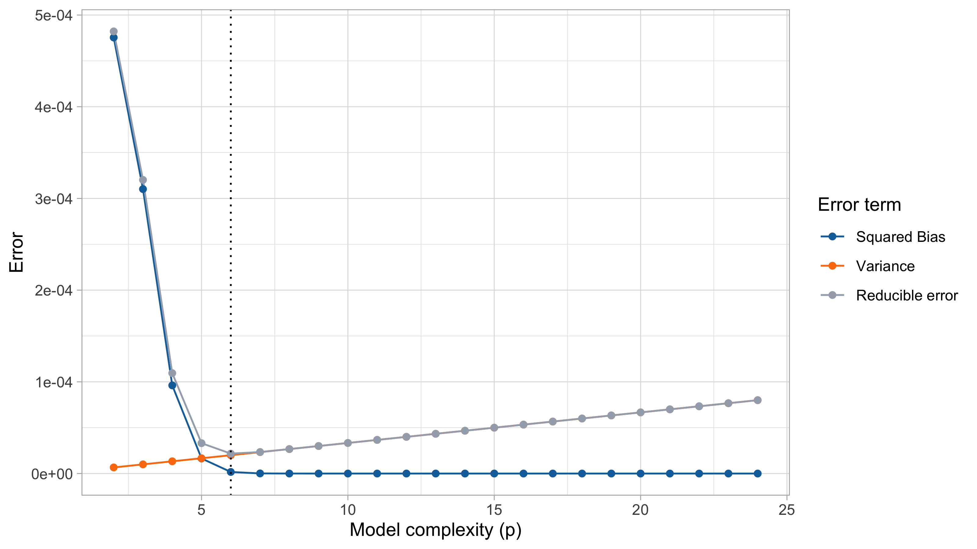 The bias term can be reduced by increasing the flexibility of the model (e.g., by considering a high value for p).