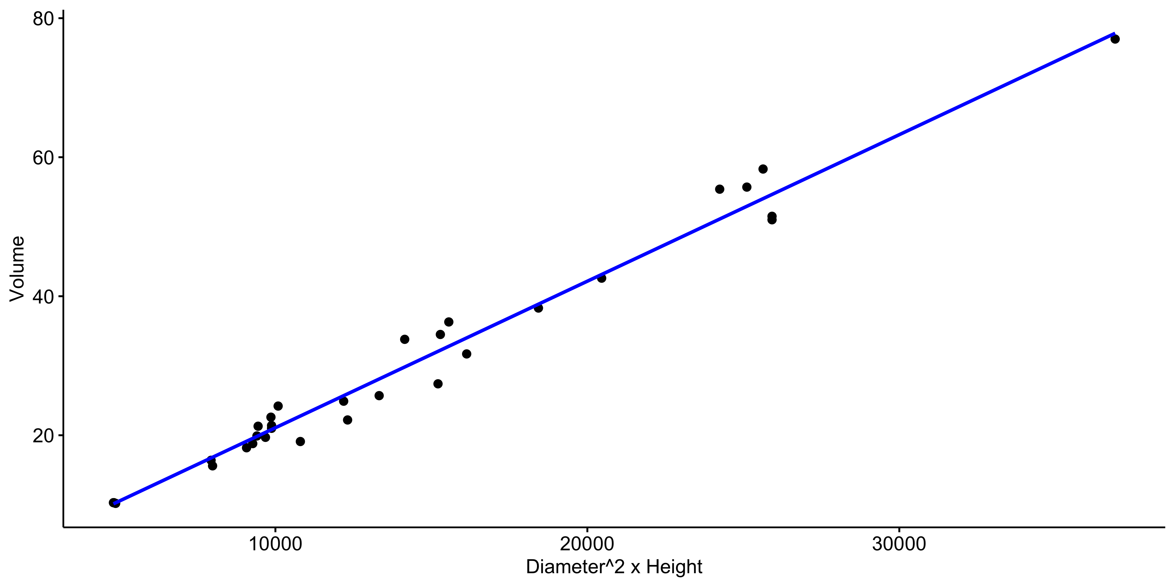 The previous reasoning suggests the regression model \mathrm{Volume} = \beta \times \mathrm{Diameter}^2 \times \mathrm{Height} + \varepsilon, where \beta = \frac{\pi}{4} or \beta = \frac{\pi}{12} if trees were perfect cylinder or cones.