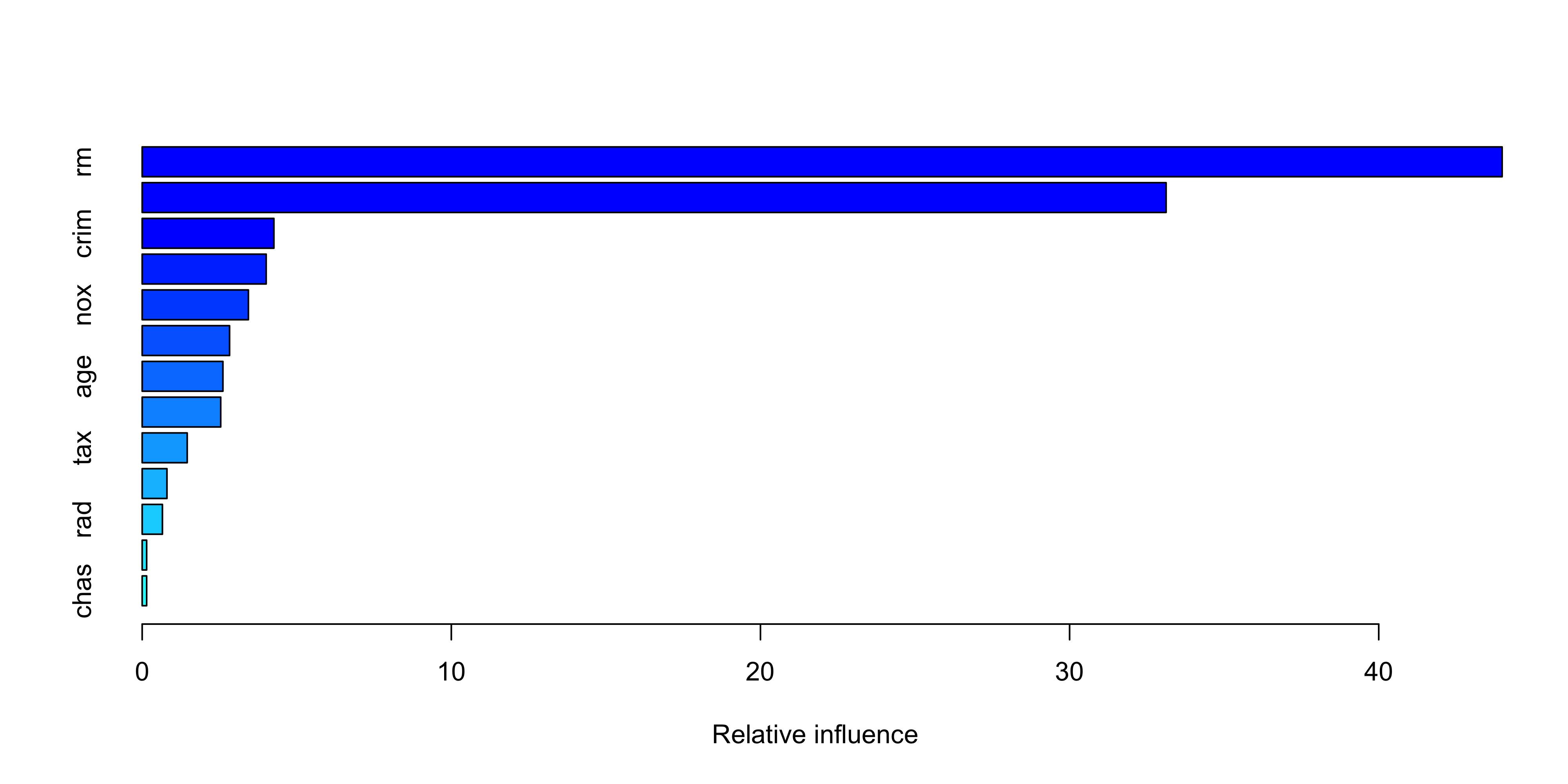 lstat (wealth / socioeconomic status)rm (house size / number of rooms)gbm package to fit boosted regression treesgbm() to the Boston datasetdistribution = "gaussian" for regression problemssummary() provides: