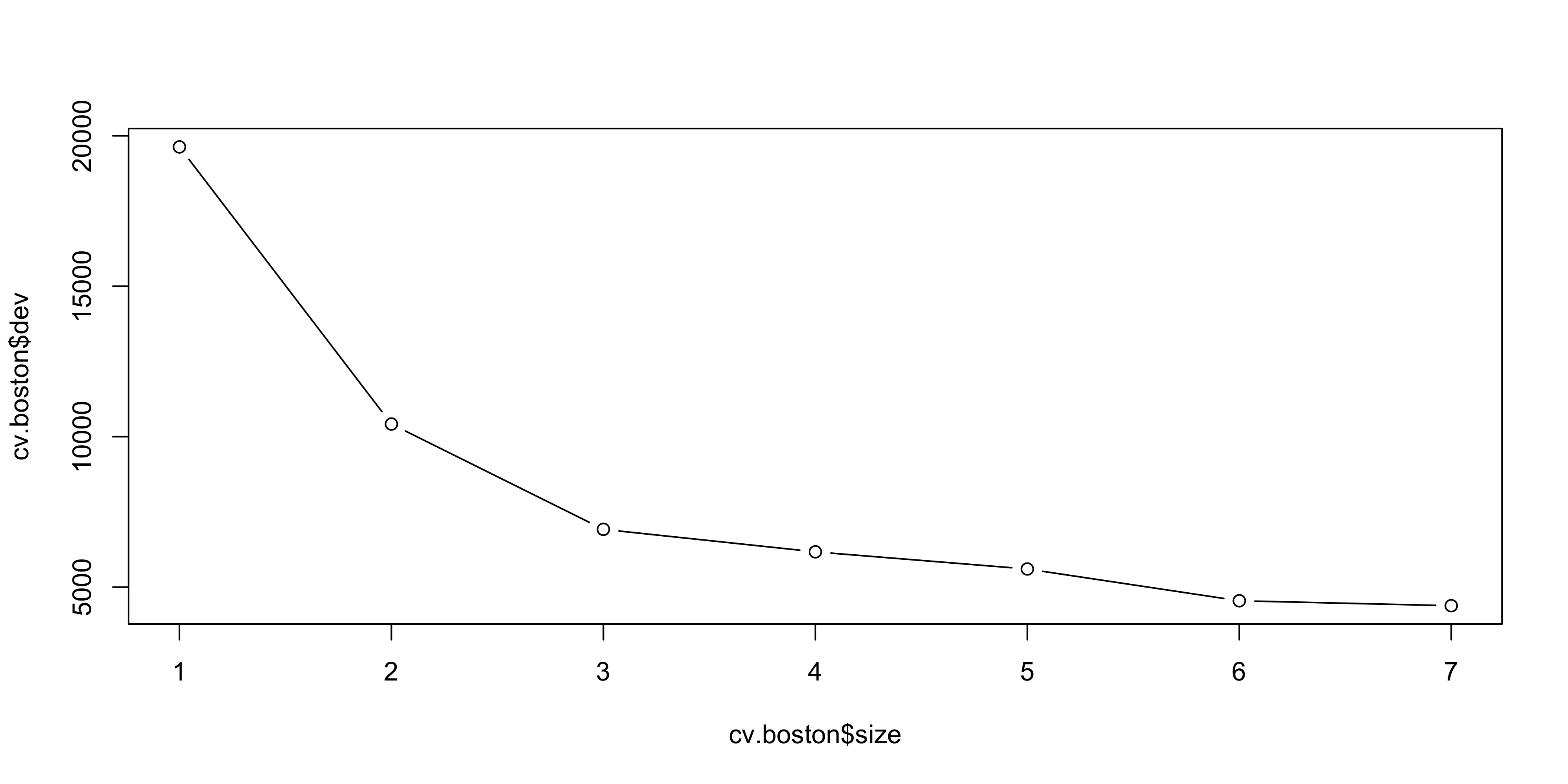 cv.tree() to evaluate pruning via cross-validationyhat <- predict(tree.boston, newdata = Boston[-train, ])