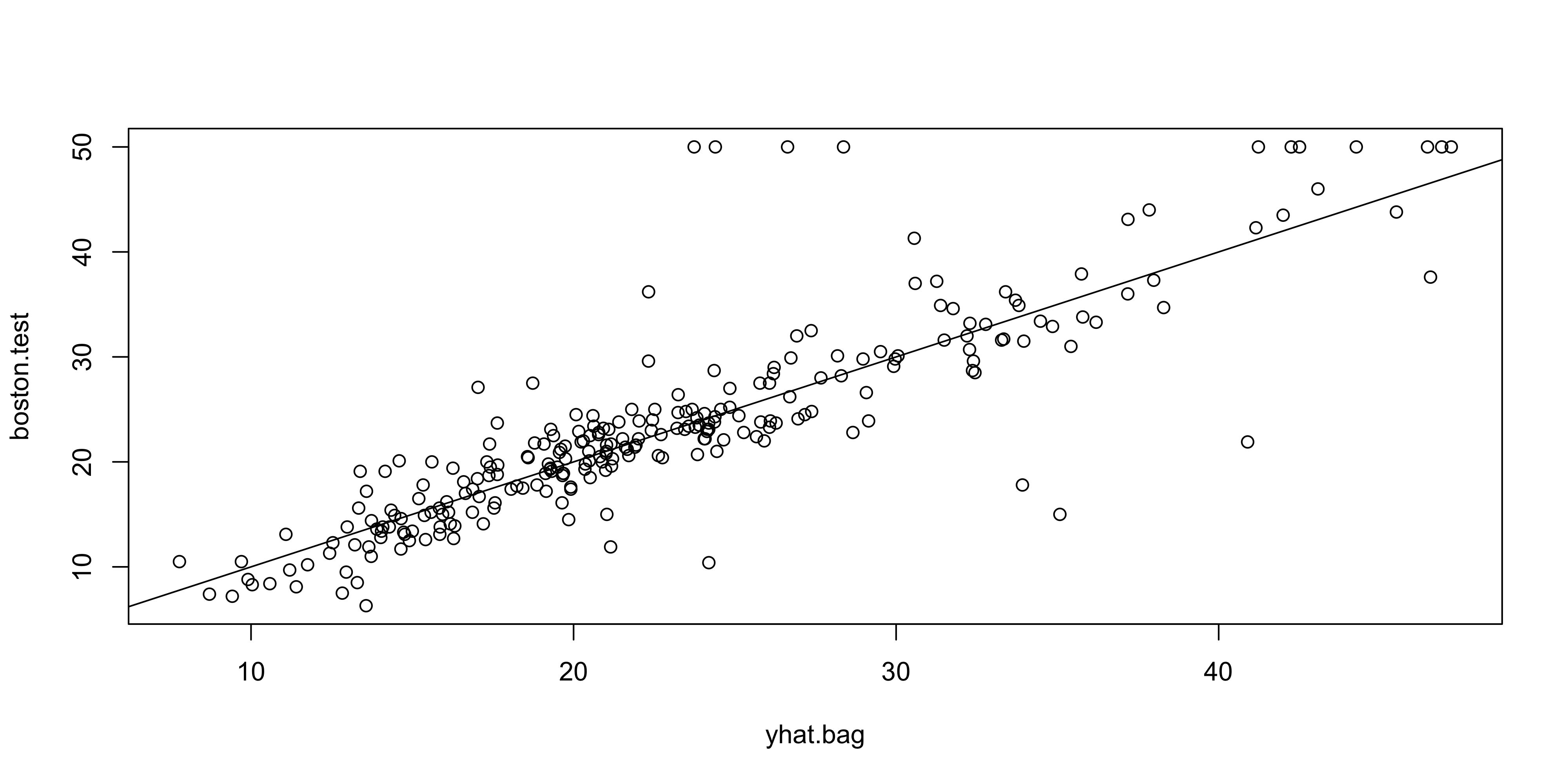 lstat and rm are the most important variablesrm → higher house priceslstat → lower house pricesmedv on the test setyhat.boost <- predict(boost.boston,